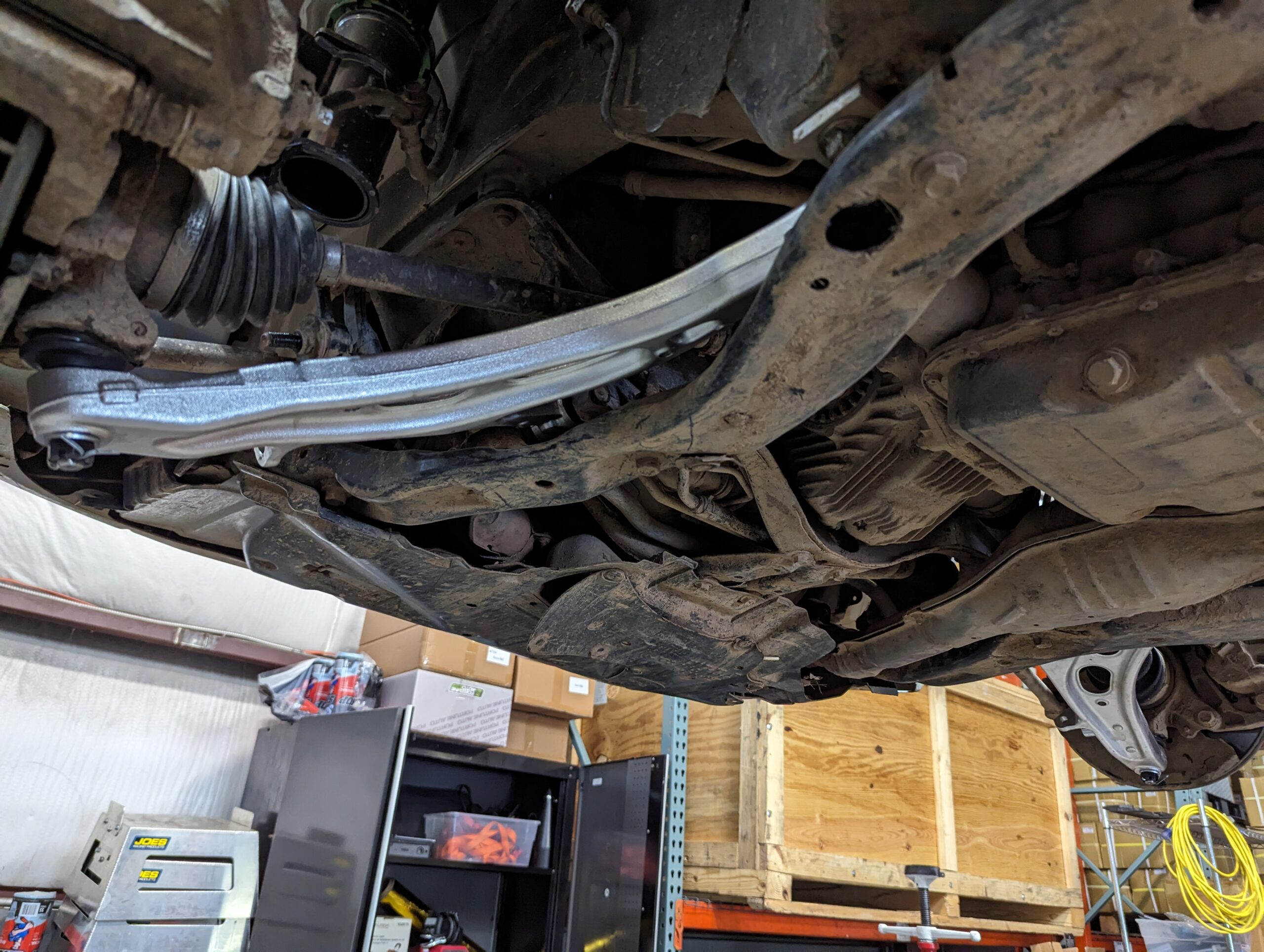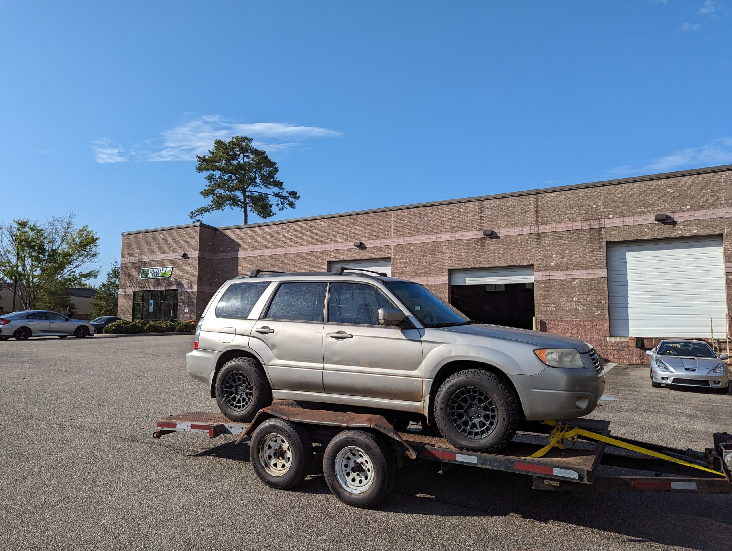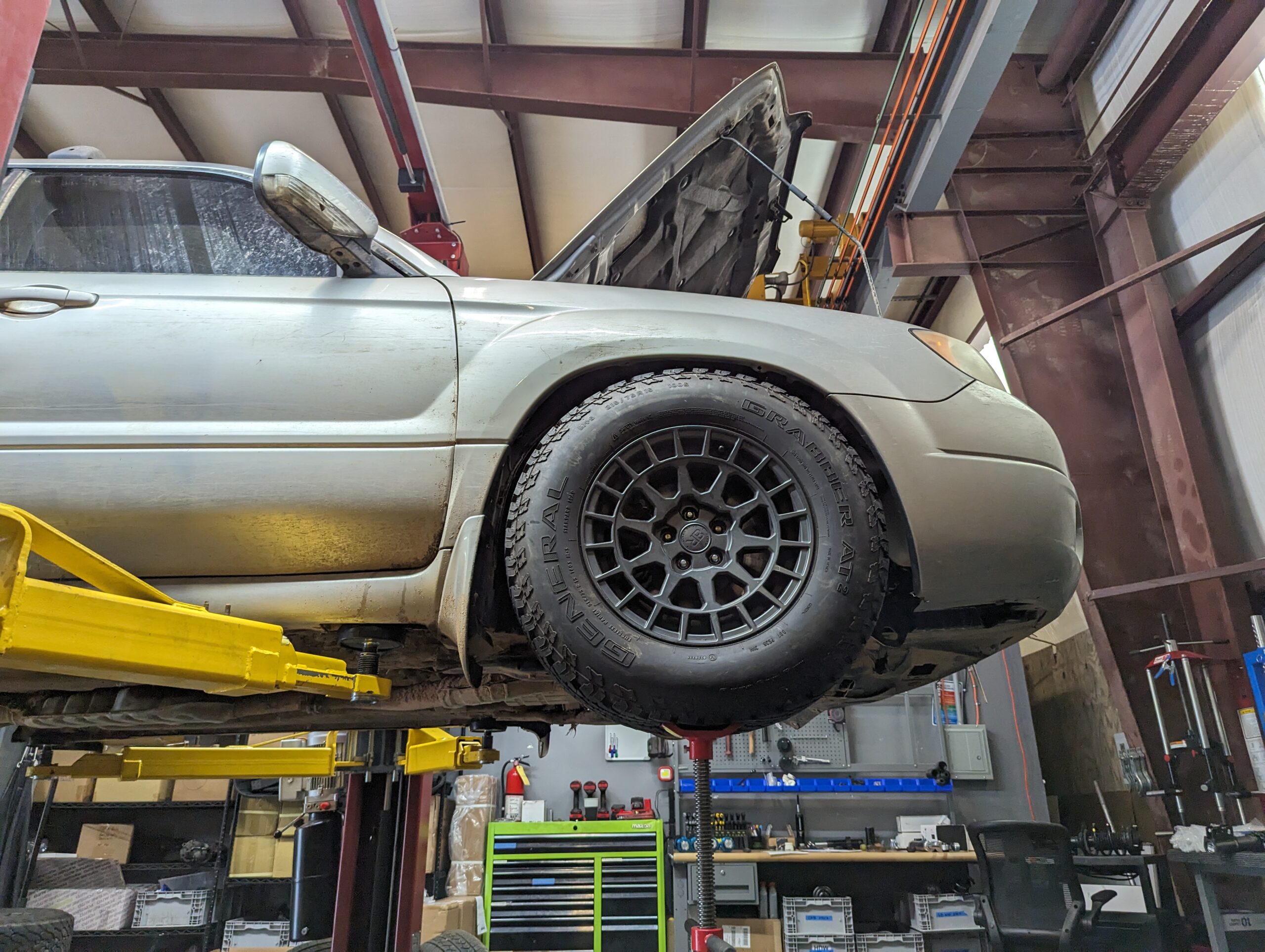 Getting this to all work together came with some additional challenges. None of this was about the aggressive styling, it was about the functional performance off-road at relatively high speeds. For this to be the most fun, it all needed to happen without any rubbing even with the suspension under full compression, and steering at full lock. No exceptions. The coilover setup and installation were done under the supervision and assistance of the experts at Fortune Auto, at their facility in Powhatan Va. Measurements were taken and the coilovers were installed multiple times with no springs to allow us to test for clearance under a variety of wheel positions. We figured out fast that the front tires were going to rub a good but on a pinch weld at the front. A quick check on the googler found that STi lower control arms are a direct replacement for the ones on the SG Forester. These lower front control arms provide additional castor angle, and, more importantly, for this ugly forester, tire clearance at that one critical point that was a problem. It was also discovered that the rear lower control / lateral bars were as crooked as 4 little politicians who wanted to make sure the car had as much positive camber as possible…. Off to the parts store.