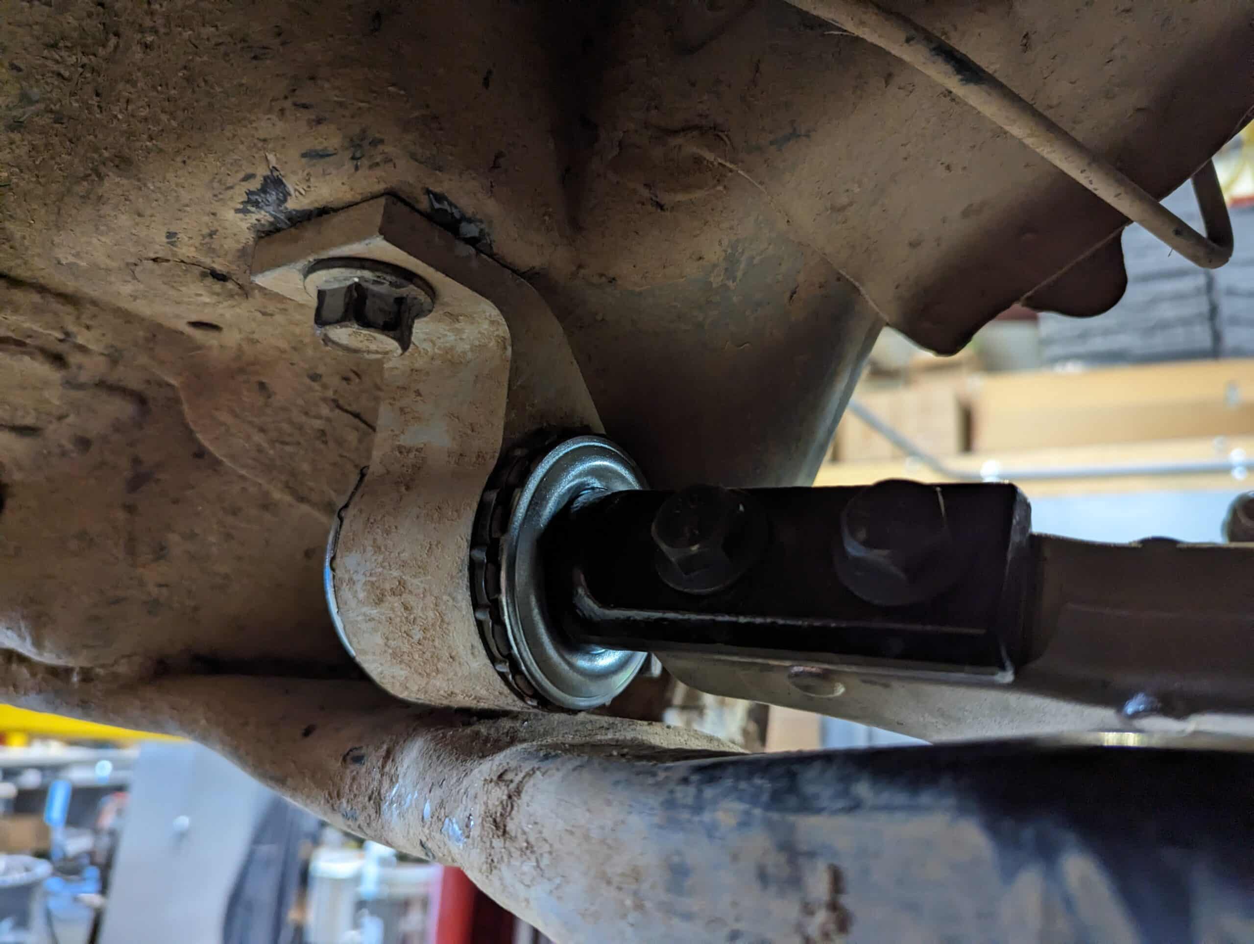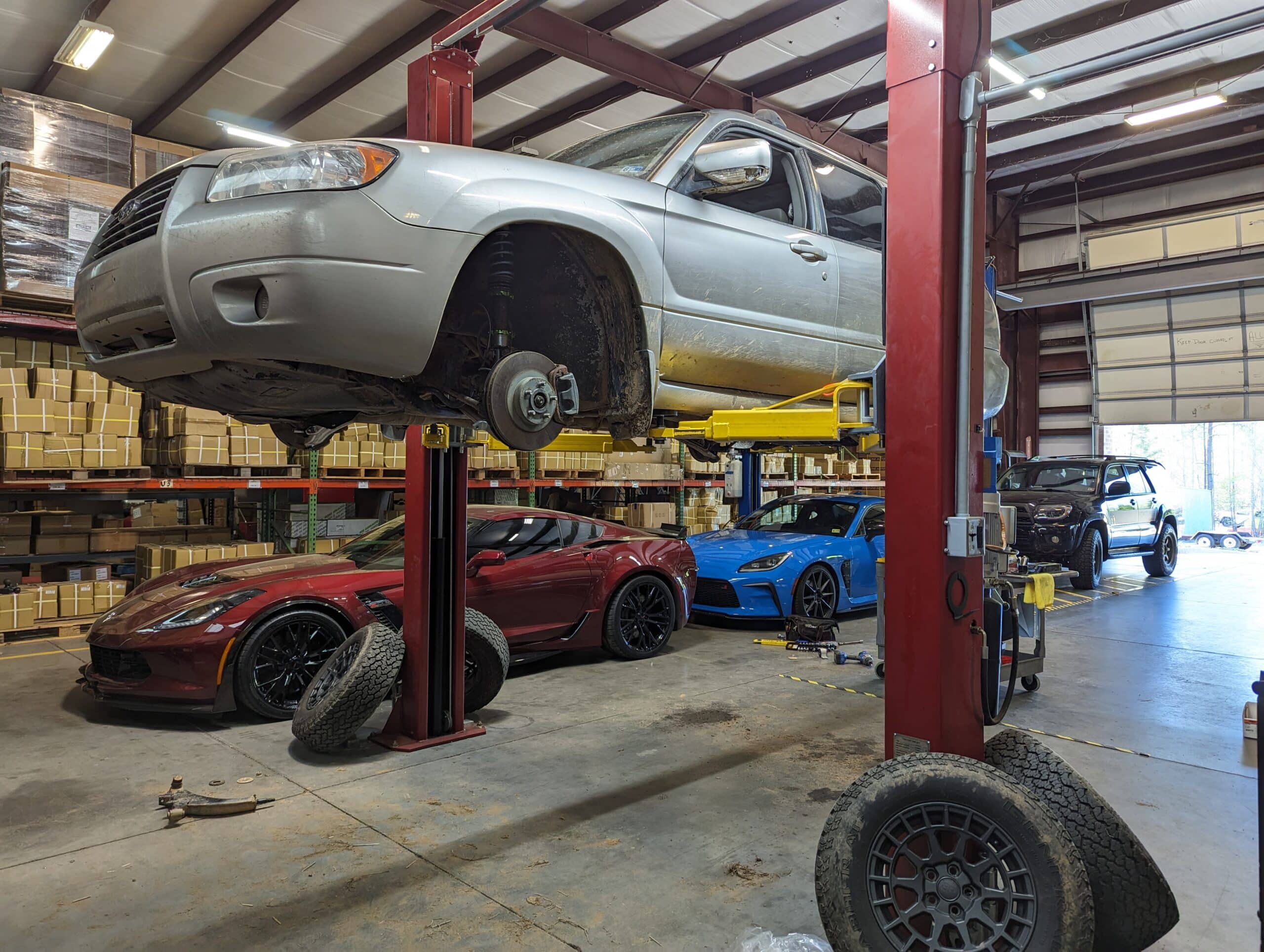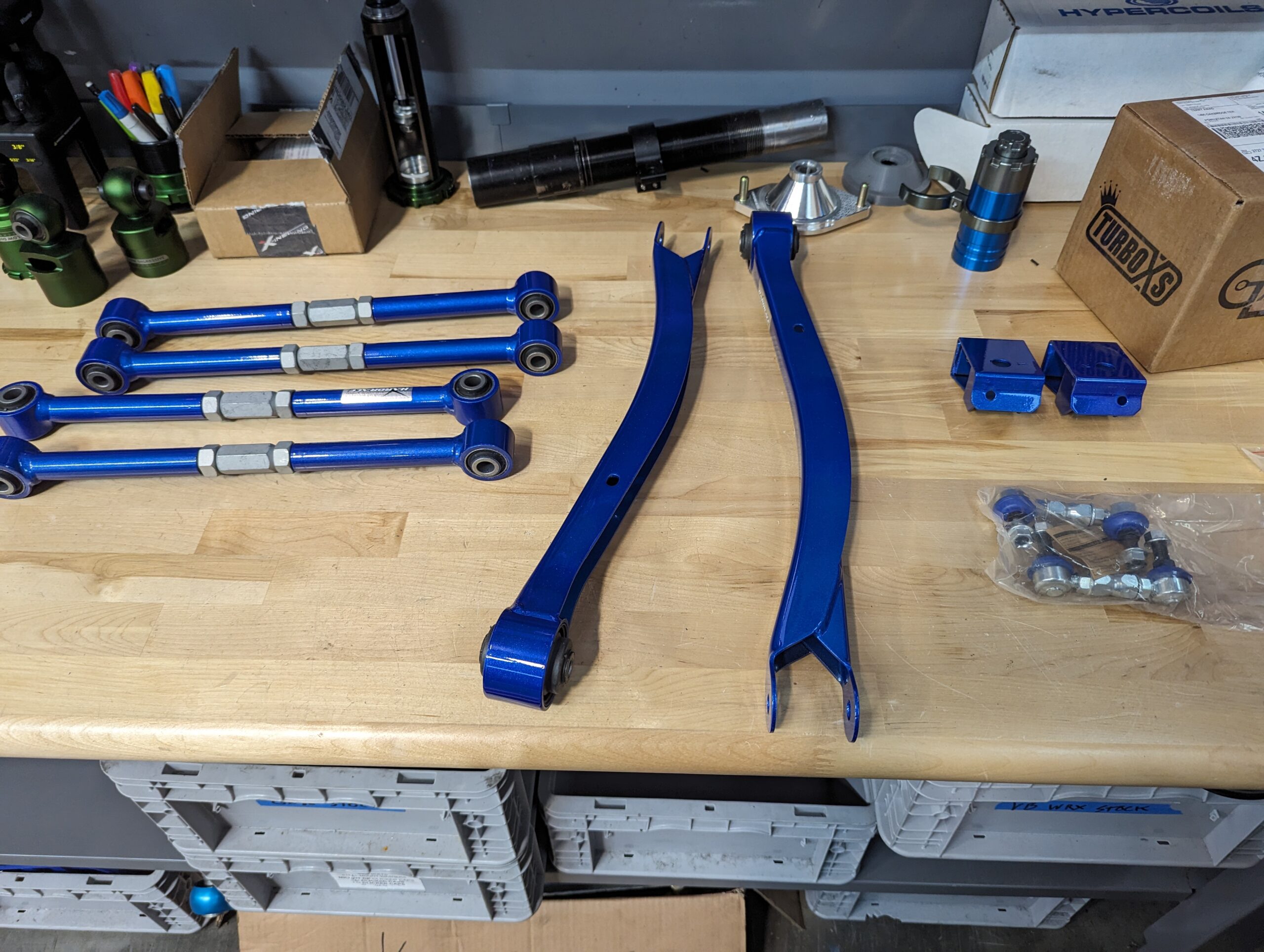 Getting this to all work together came with some additional challenges. None of this was about the aggressive styling, it was about the functional performance off-road at relatively high speeds. For this to be the most fun, it all needed to happen without any rubbing even with the suspension under full compression, and steering at full lock. No exceptions. The coilover setup and installation were done under the supervision and assistance of the experts at Fortune Auto, at their facility in Powhatan Va. Measurements were taken and the coilovers were installed multiple times with no springs to allow us to test for clearance under a variety of wheel positions. We figured out fast that the front tires were going to rub a good but on a pinch weld at the front. A quick check on the googler found that STi lower control arms are a direct replacement for the ones on the SG Forester. These lower front control arms provide additional castor angle, and, more importantly, for this ugly forester, tire clearance at that one critical point that was a problem. It was also discovered that the rear lower control / lateral bars were as crooked as 4 little politicians who wanted to make sure the car had as much positive camber as possible…. Off to the parts store.