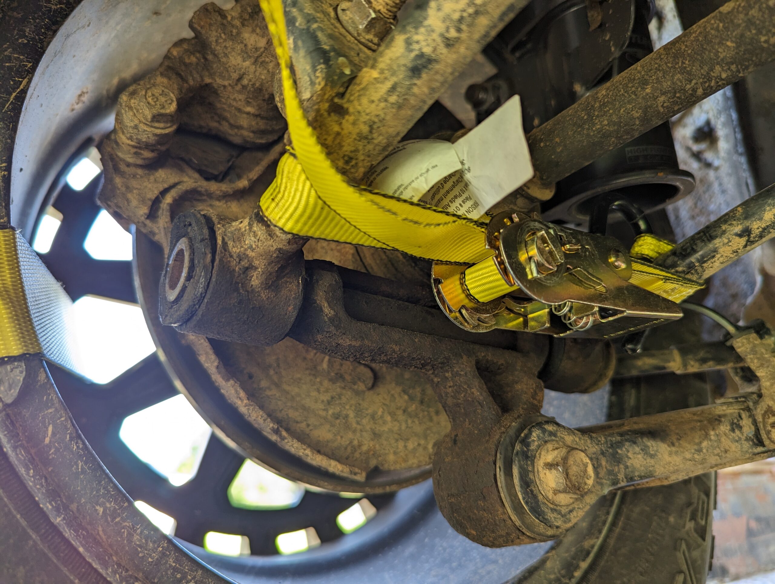 Returning to the lift with a brand new set of STi lower control arms, (new Dorman units found on Amazon here: Left – Right) And, a rear control arm upgrade (by Hardrace purchased from Rallitek) it was time to get this all back together. As hoped, the STi lower control arms provided the clearance needed for the front tires. Sadly, the hardware on the rear suspension started breaking and we were unable to get the hardrace bars installed. Once I got the car back here, not to be completely defeated, a ratchet strap was employed as an EXTRA “safety” in the event that the seized bolt decided to free up. (it hasn’t yet) Because just waiting for the new hardware to come in, allowing the installation of the rear bars before driving this car on the dirt was just not an option.