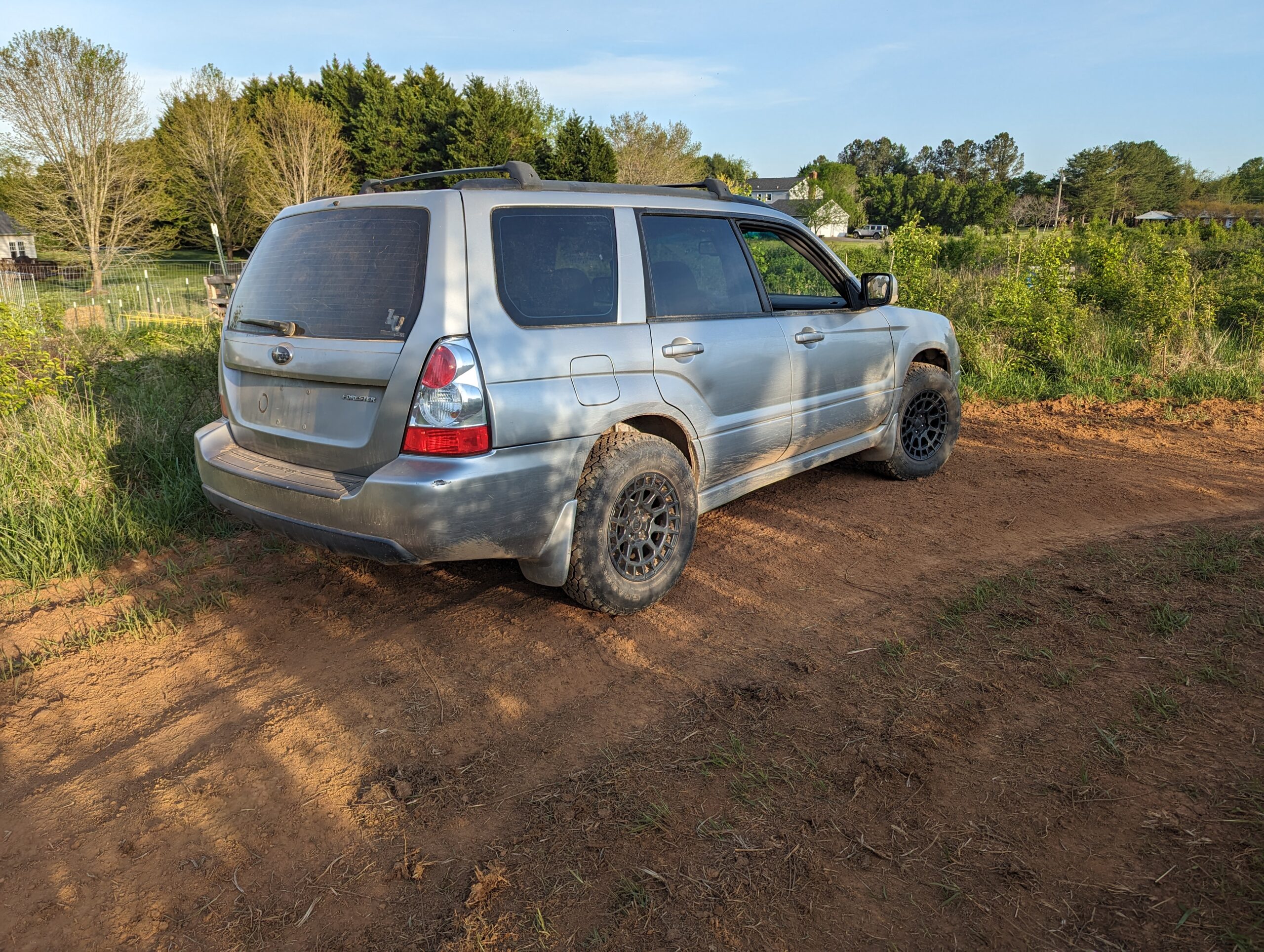 With a plan to fix the “surprise” understeer, the next thing to work on is overall traction. I was driving this car when I heard tires squeal for the first time in the dirt and realized just how much traction can be available with street tires under the best conditions. However, the second a drop of rain falls or you hit a patch of grass everything changes, fast. Street tires can get it done in the dirt and dust but to maintain consistent traction in a variety of conditions off-road, I was going to need tires with a more aggressive tread. Legitimate rally tires are out there but they are expensive. Snow tires are popular as an affordable stand-in but I am in Goochland Virginia, and we have mud here. That requires truck tires. And, to get those tires to fit a Subaru required some 15″ rally-style wheels. As seen in a previous post I was able to find a set of wheels & tires at a fair price on Facebook Marketplace that were previously installed on a slightly lifted Forester XT so I knew these would work for my application too.