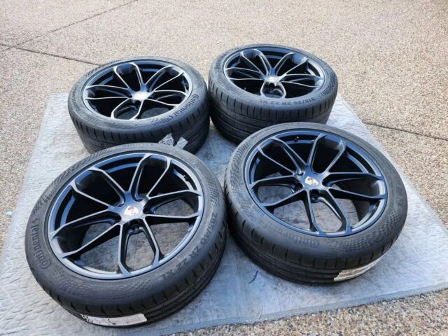 This auction is for a new set of Original, Equipment, OEM, Factory, Genuine Porsche Cayenne 9Y0 Cayenne Coupe GT Competition 22" Black Satin-Mat wheels mounted with Continental Sport Contact 7 Tires, Porsche OEM Tire Pressure Monitoring Sensor (TPMS) and Porsche OEM matching Black Satin-Mat and Color Crest Center Cap set for Cayenne, Cayenne S, Cayenne GTS and Cayenne Turbo. and Turbo S from 2024 and beyond. This Porsche Cayenne 9Y0 Cayenne Coupe Competition GT 22" Wheel features 10 (Ten) spokes and a 10-inch front and 11.5-inch width in the rear wheel and the Wheel is finished in original Porsche Black Satin-Mat. The auction is for Wheels, Tires, TPMS and Porsche matching Black Satin-Mat and Color Crest Center Caps complete set mounted and balance ready to install on your car. These set of wheels and Tires are in new condition. There is no structural damage such as bends, cracks, curb rust or scratches. The wheels are straight, round and true. The wheels have the Porsche Black Satin-Mat Color Logo matching Center Caps. The wheels will fit all Porsche Cayenne 9Y0 from 2024 to 2025 and beyond. This Wheel is very nice when mounted on a Porsche Cayenne and are very rear to find especially one that comes with Continental Sport Contact 7 Tires for Porsche. Wheels and Tires are in new condition.
